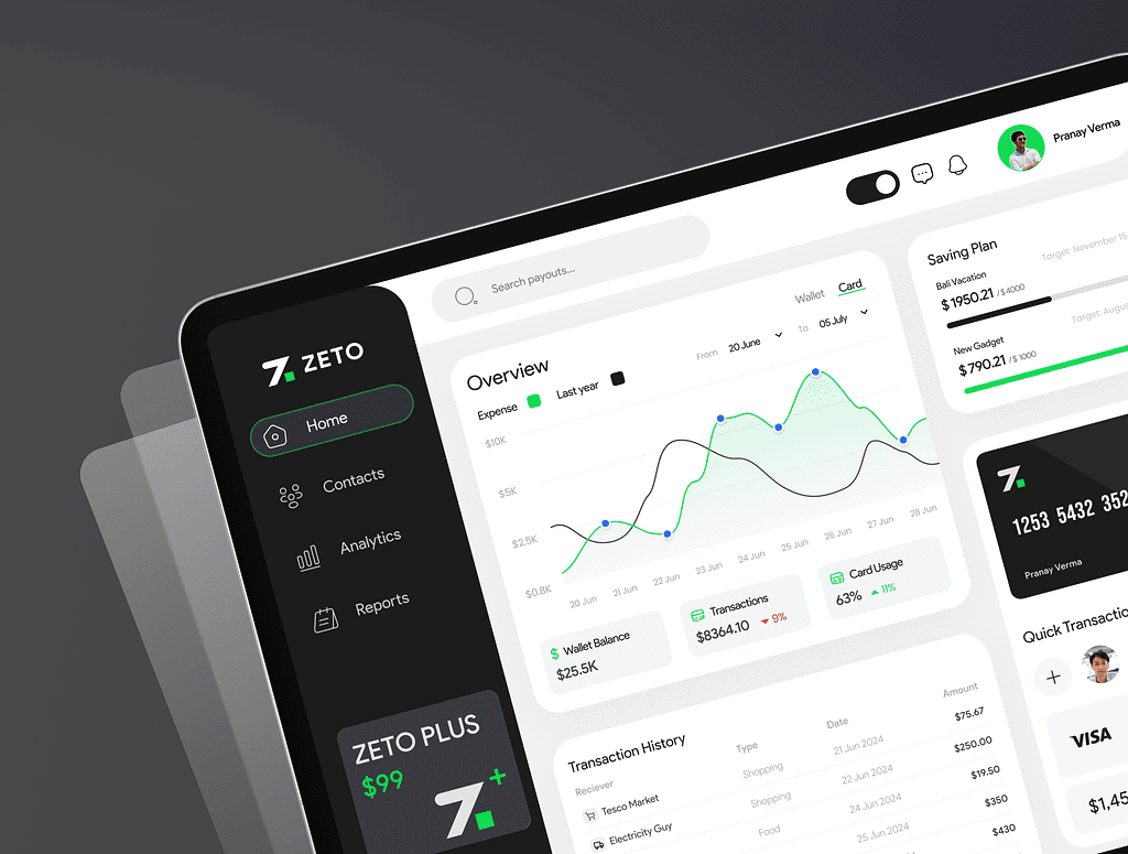 Our financial management dashboard boasts a sleek and modern design, meticulously crafted to streamline your financial journey. The interface features a clean layout with intuitive navigation, ensuring effortless access to key financial data and tools. At its core, the dashboard offers comprehensive financial overview widgets, providing at-a-glance insights into your transactions, savings plans and overall expenses.