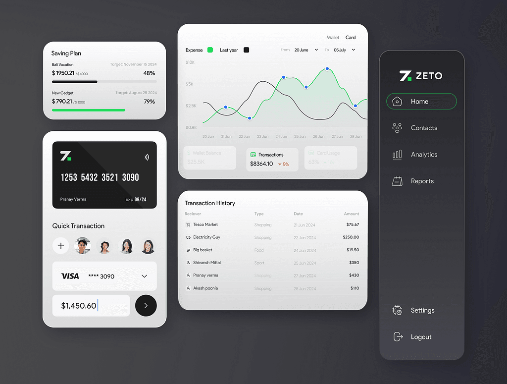 Our financial management dashboard boasts a sleek and modern design, meticulously crafted to streamline your financial journey. The interface features a clean layout with intuitive navigation, ensuring effortless access to key financial data and tools. At its core, the dashboard offers comprehensive financial overview widgets, providing at-a-glance insights into your transactions, savings plans and overall expenses.